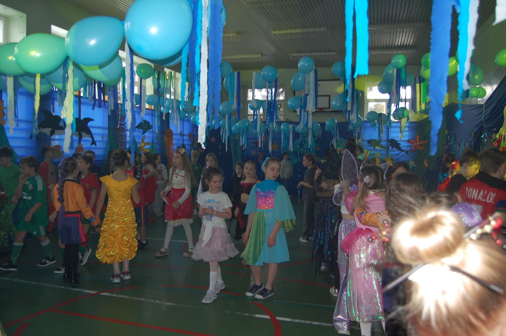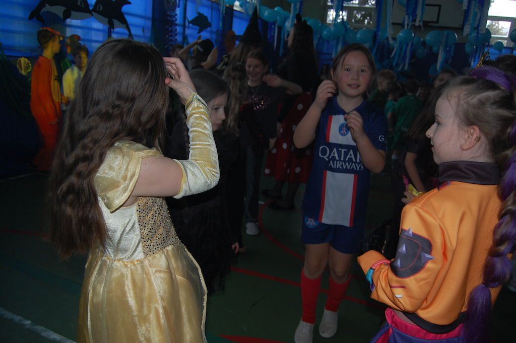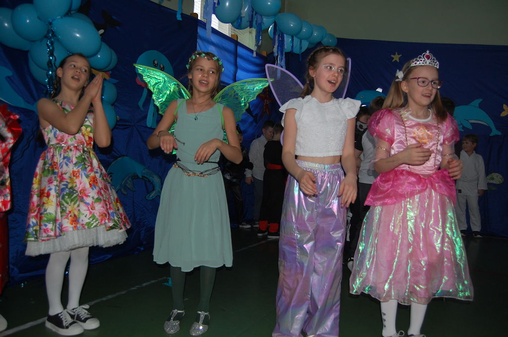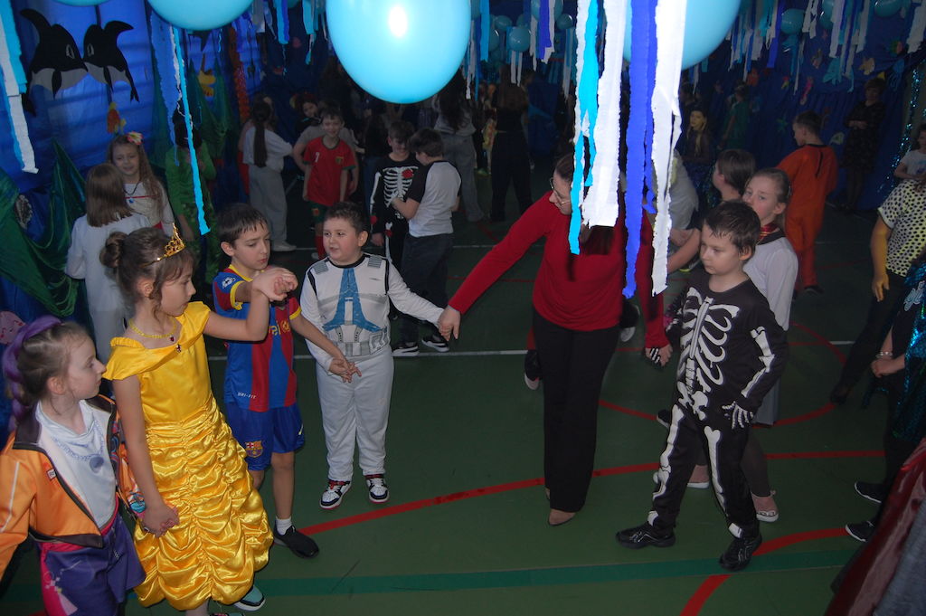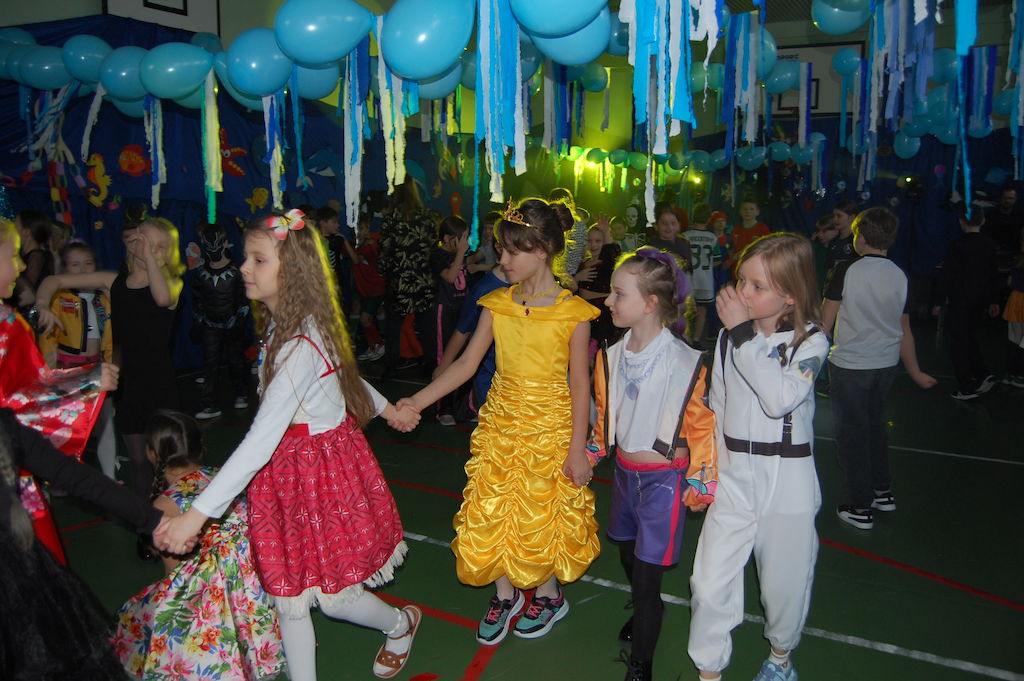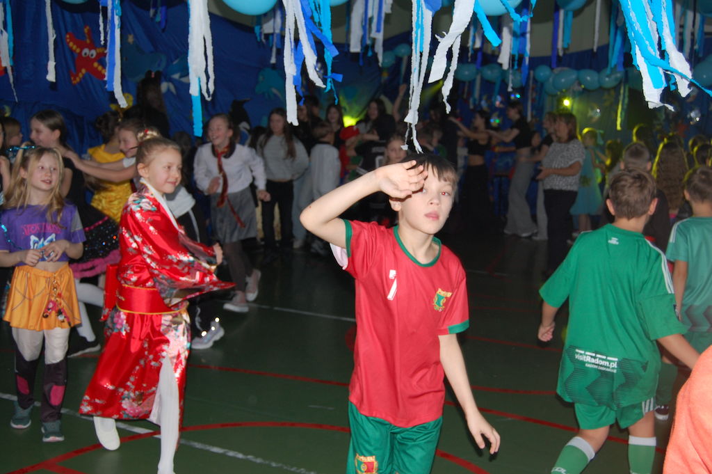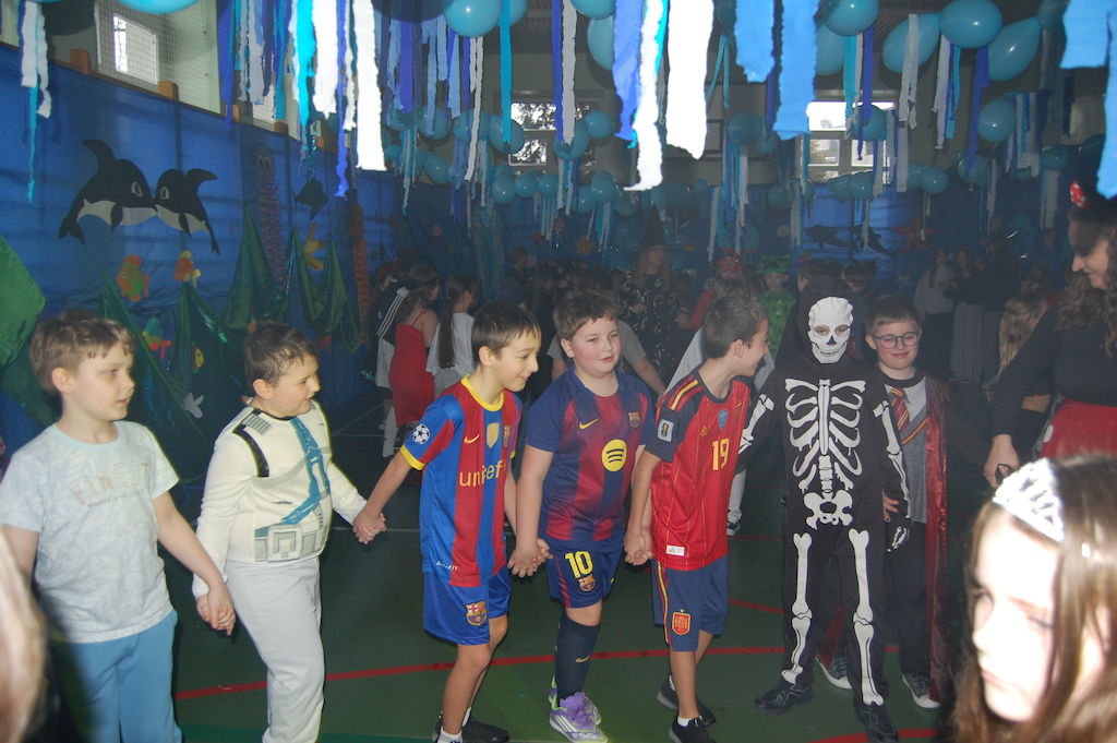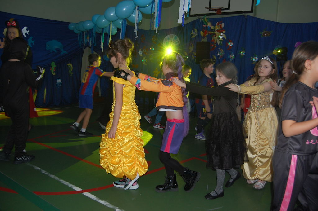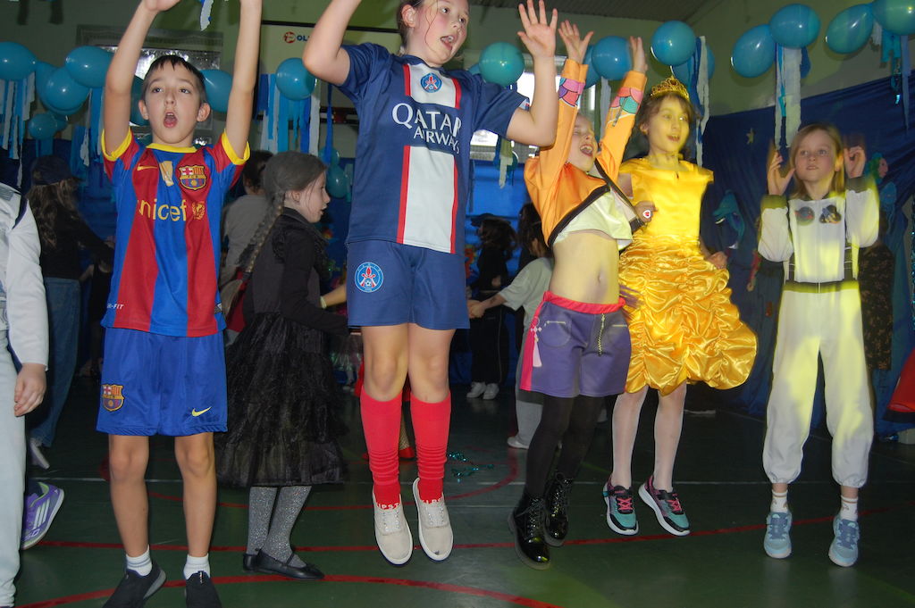 Tak właśnie było 10 lutego – mała sala sportowa, pięknie udekorowana, zupełnie zmieniła swoje oblicze i stała się prawdziwą salą balową. Przed południem bawiły się klasy 1–3, natomiast po południu parkiet należał do uczniów klas 4–6. Było to niezwykłe wydarzenie, pełne barw, pomysłowości i beztroskiej radości, które na długo pozostanie