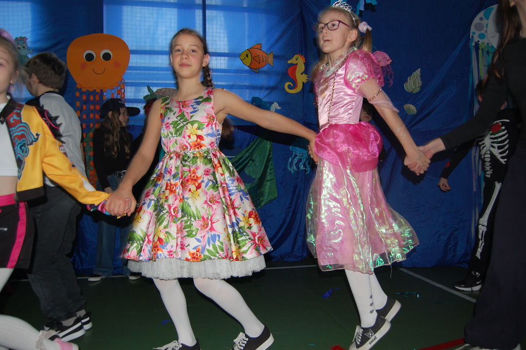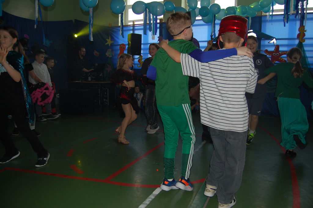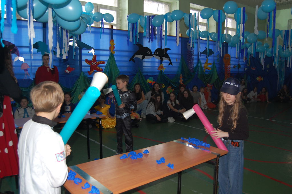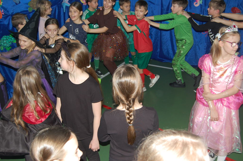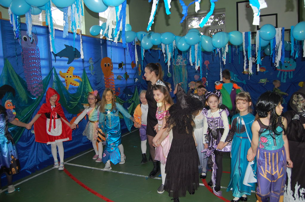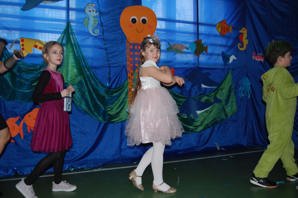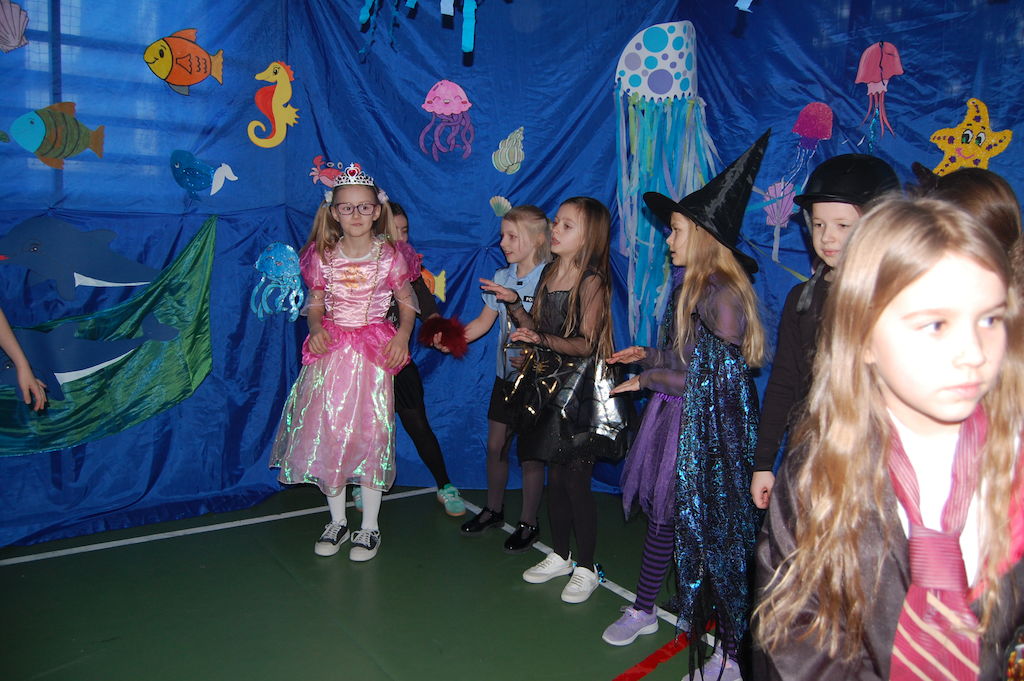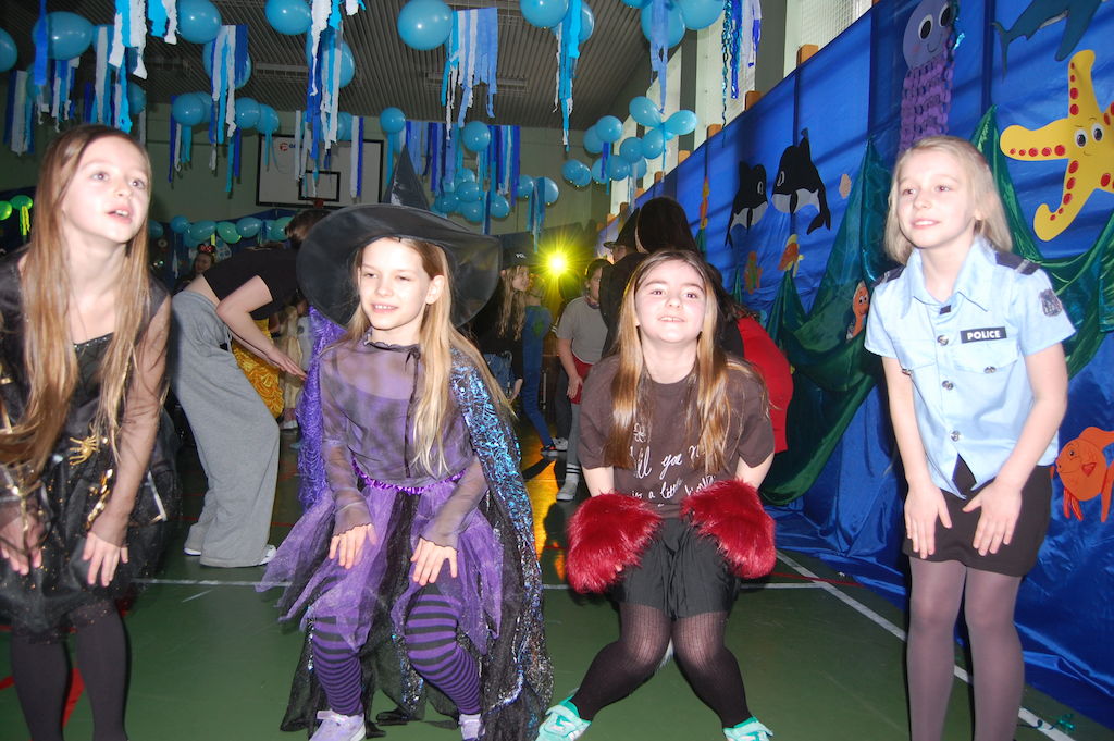 Tak właśnie było 10 lutego – mała sala sportowa, pięknie udekorowana, zupełnie zmieniła swoje oblicze i stała się prawdziwą salą balową. Przed południem bawiły się klasy 1–3, natomiast po południu parkiet należał do uczniów klas 4–6. Było to niezwykłe wydarzenie, pełne barw, pomysłowości i beztroskiej radości, które na długo pozostanie