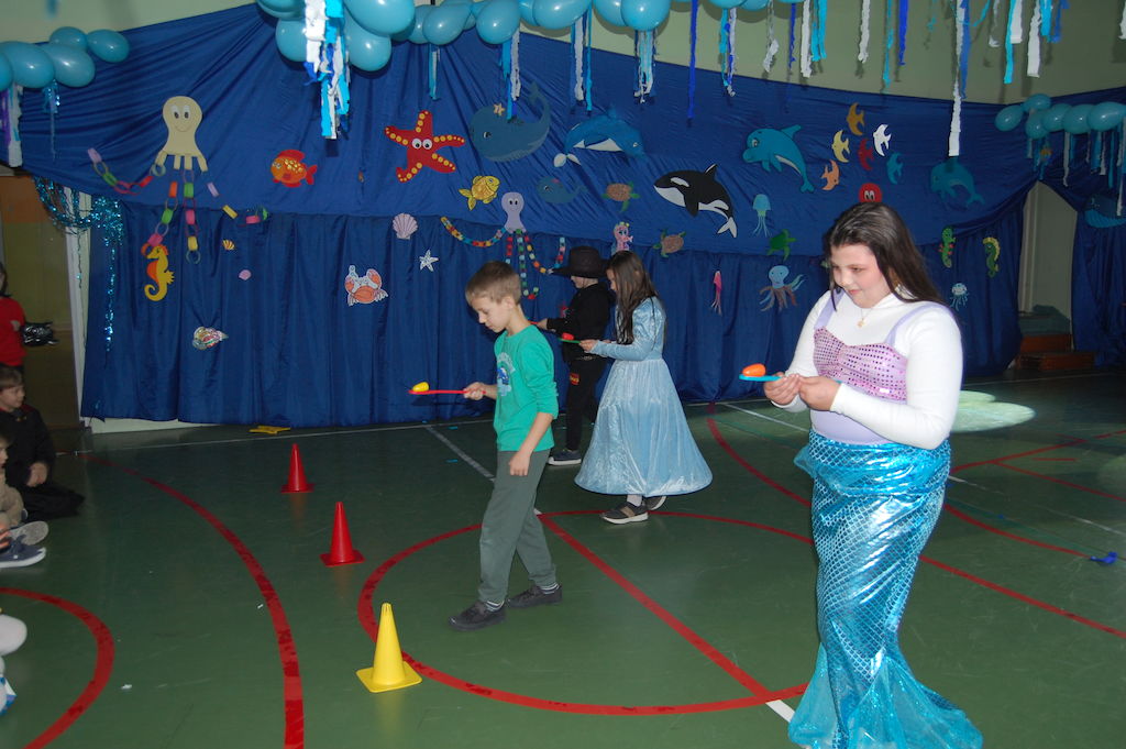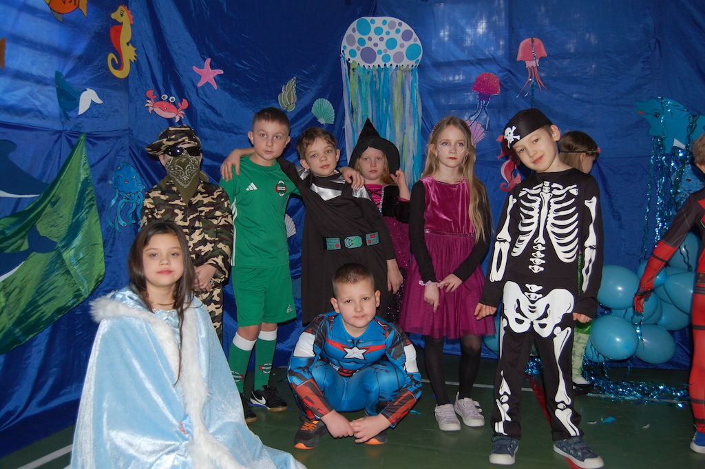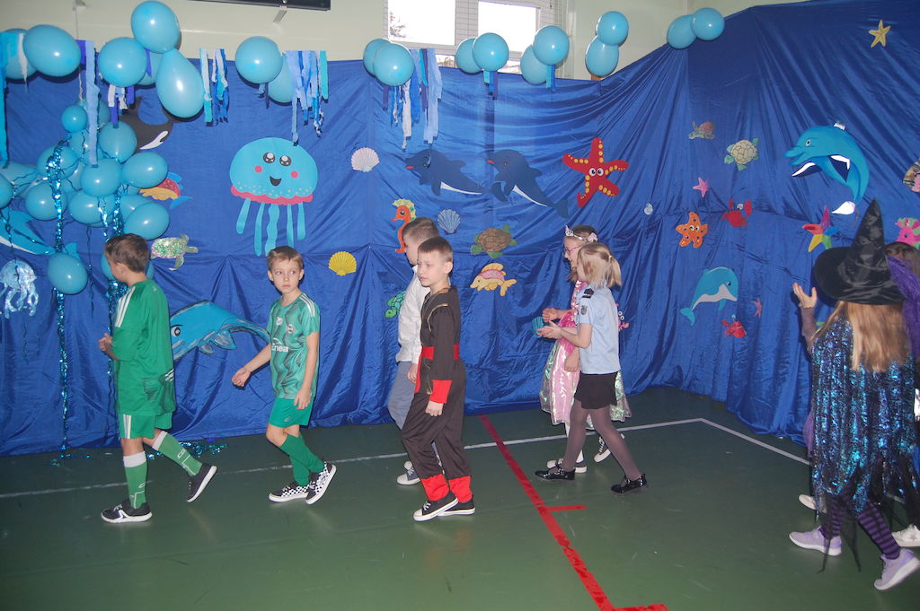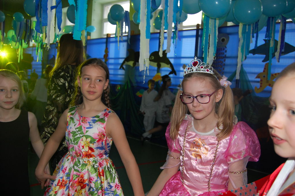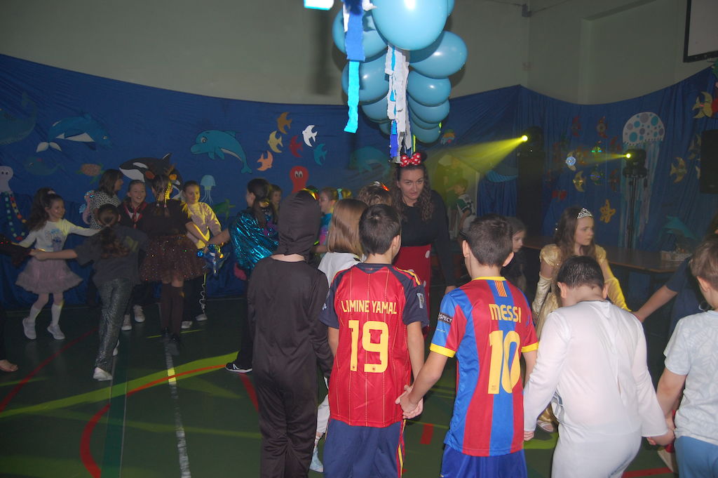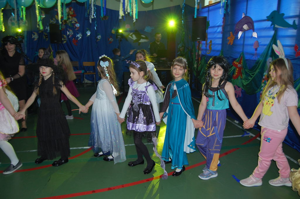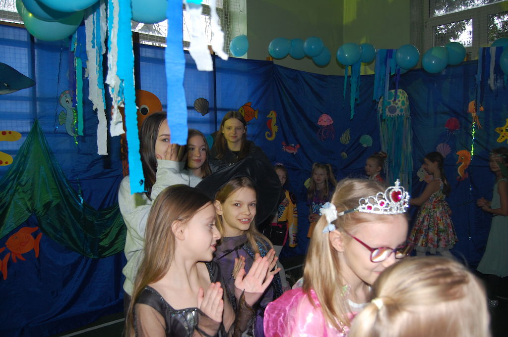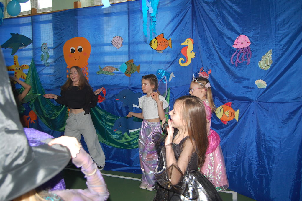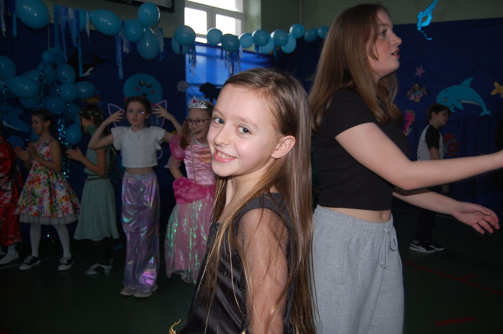 Tak właśnie było 10 lutego – mała sala sportowa, pięknie udekorowana, zupełnie zmieniła swoje oblicze i stała się prawdziwą salą balową. Przed południem bawiły się klasy 1–3, natomiast po południu parkiet należał do uczniów klas 4–6. Było to niezwykłe wydarzenie, pełne barw, pomysłowości i beztroskiej radości, które na długo pozostanie