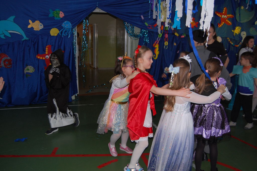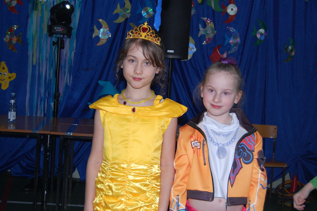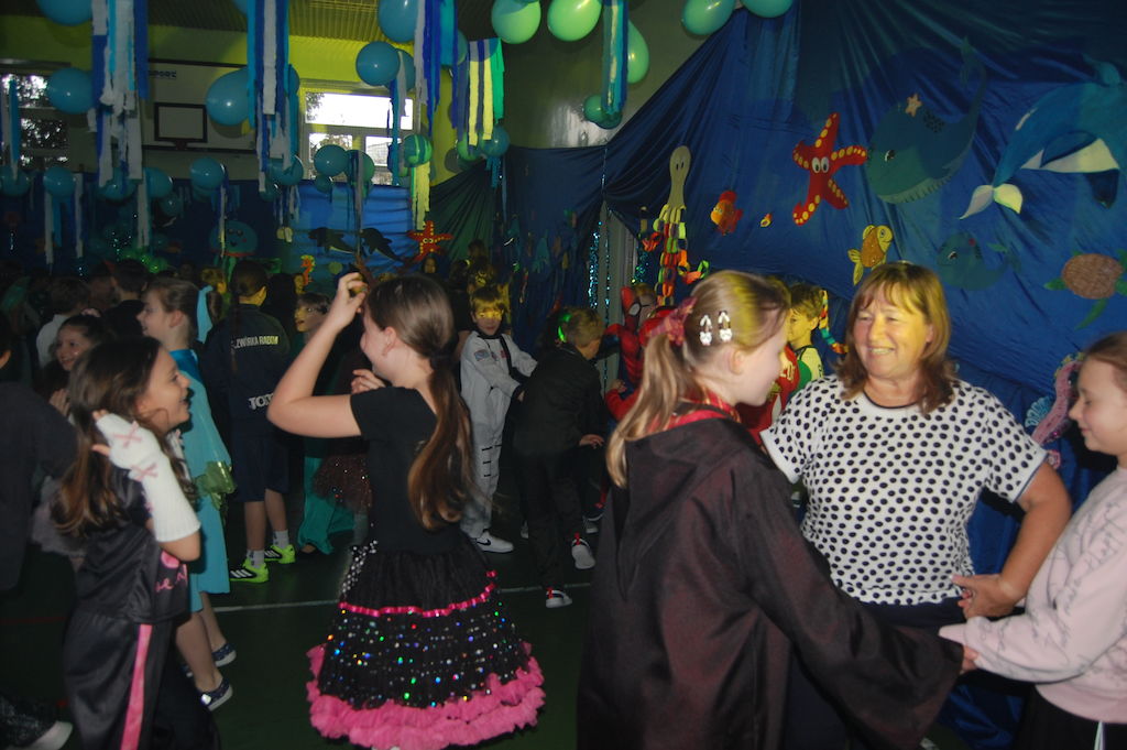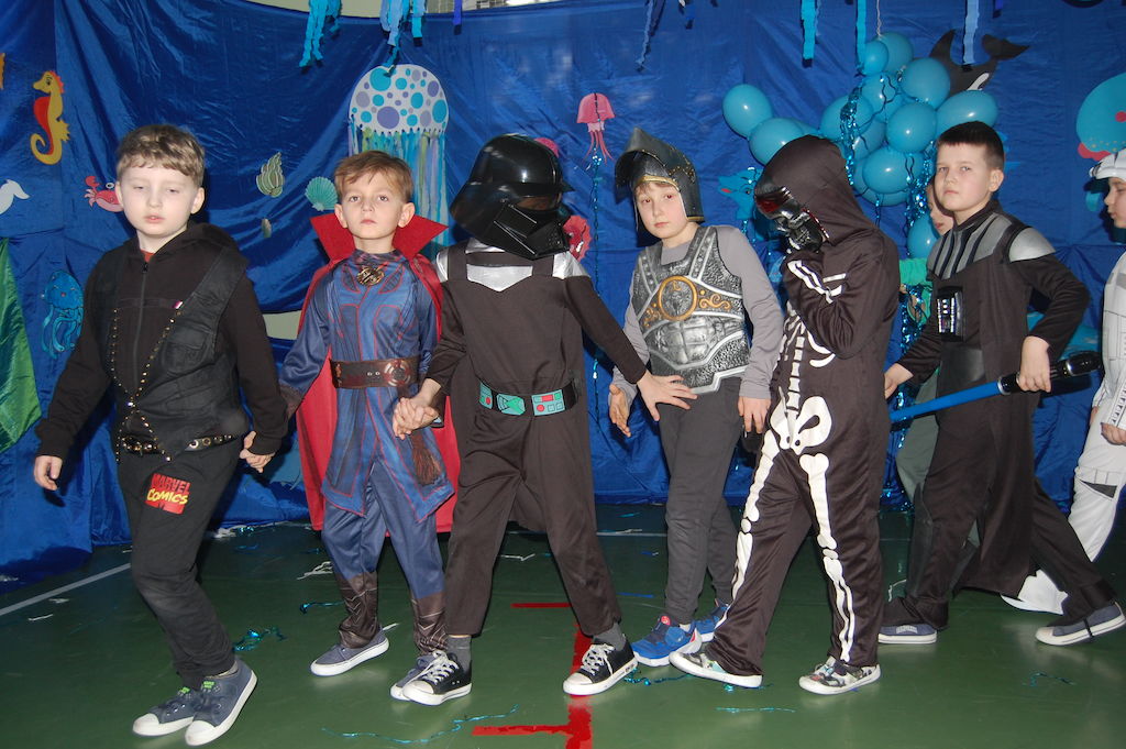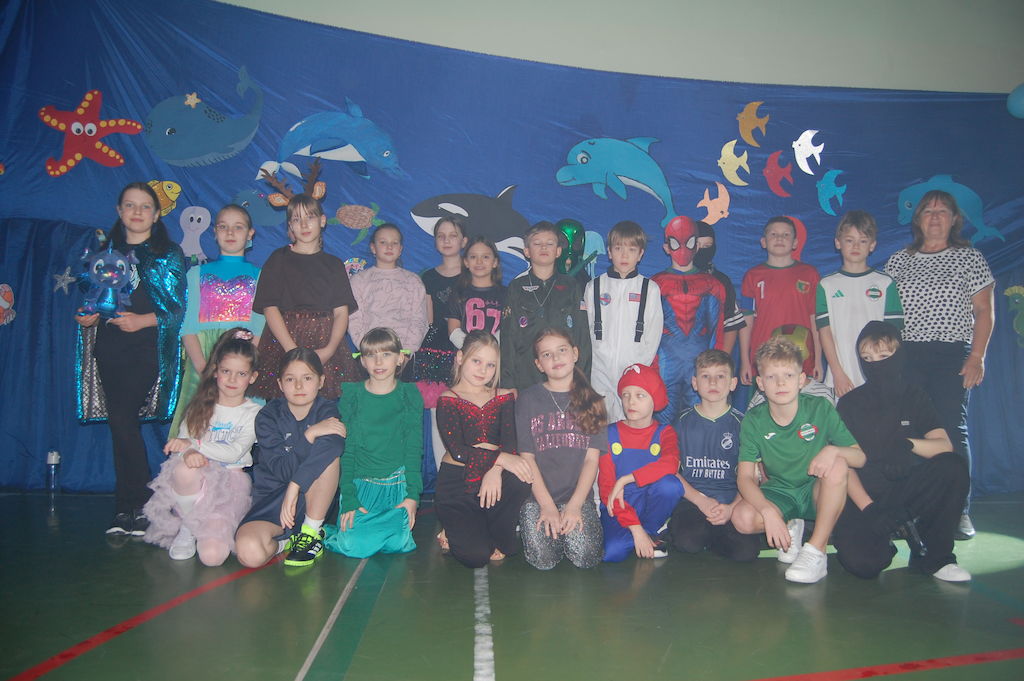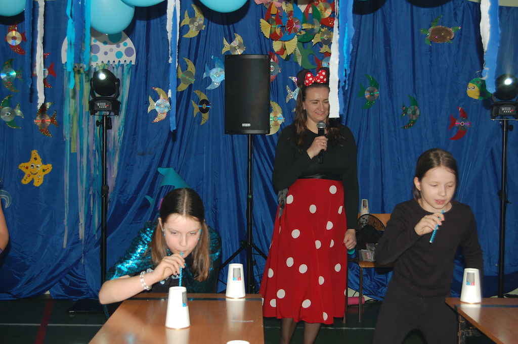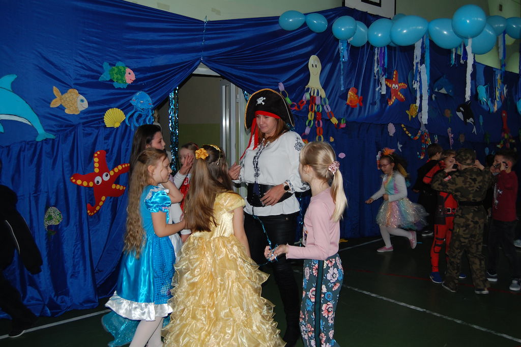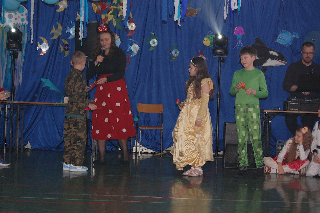 Tak właśnie było 10 lutego – mała sala sportowa, pięknie udekorowana, zupełnie zmieniła swoje oblicze i stała się prawdziwą salą balową. Przed południem bawiły się klasy 1–3, natomiast po południu parkiet należał do uczniów klas 4–6. Było to niezwykłe wydarzenie, pełne barw, pomysłowości i beztroskiej radości, które na długo pozostanie