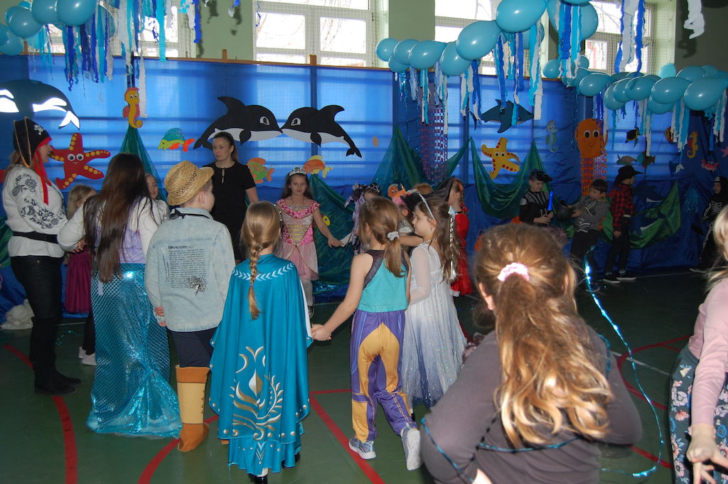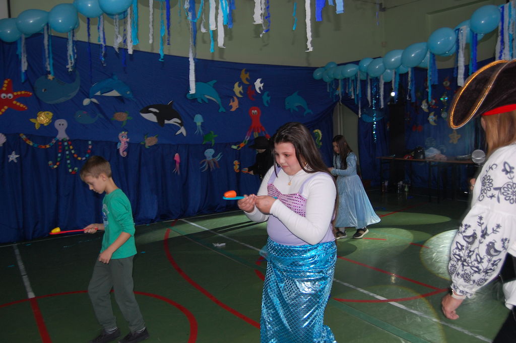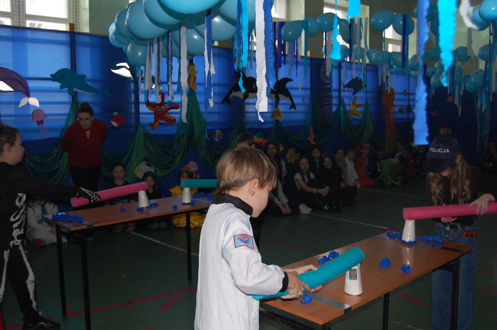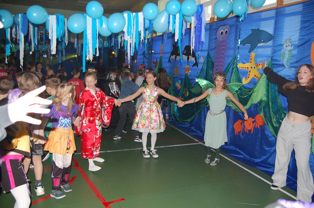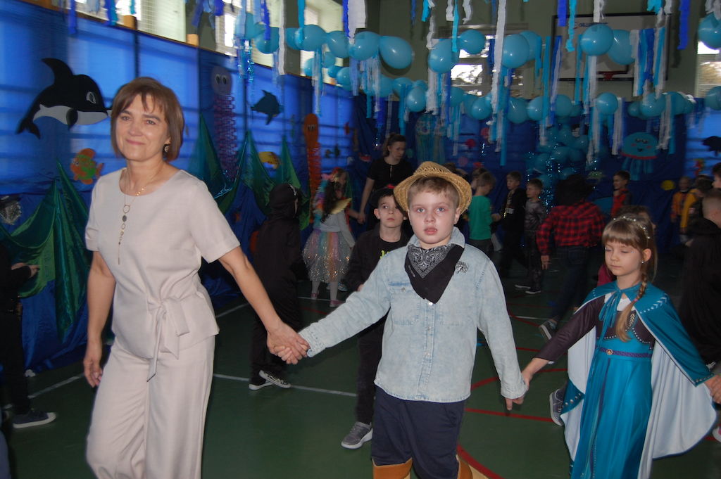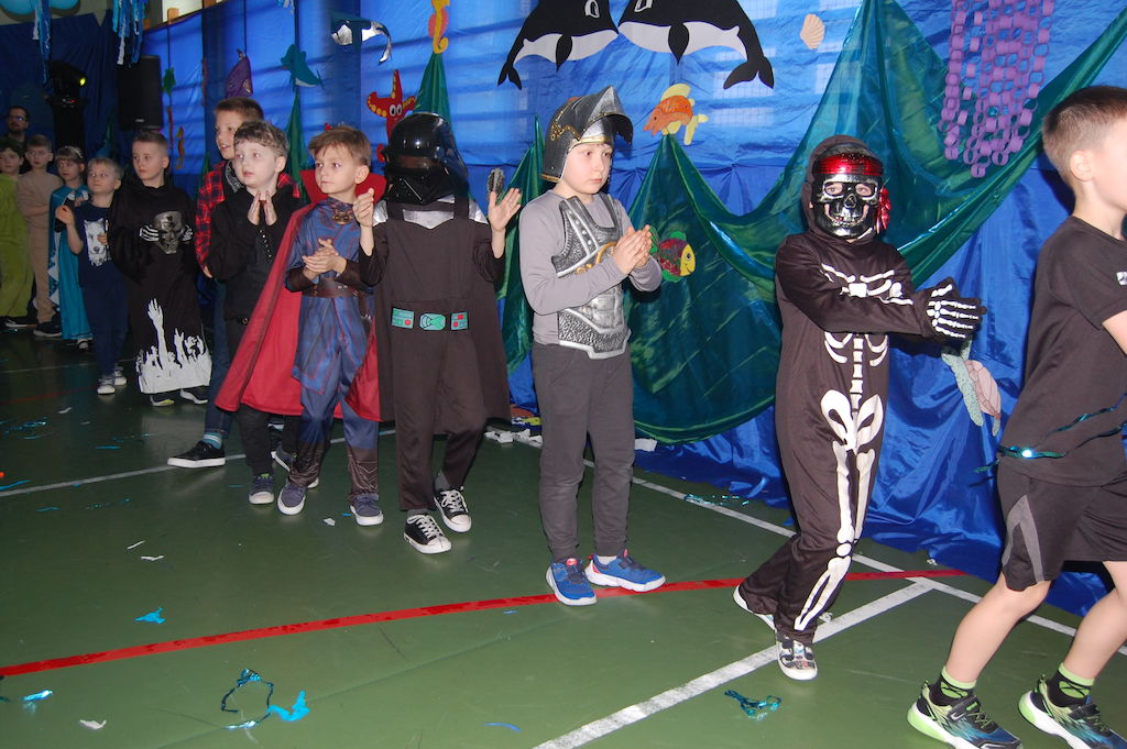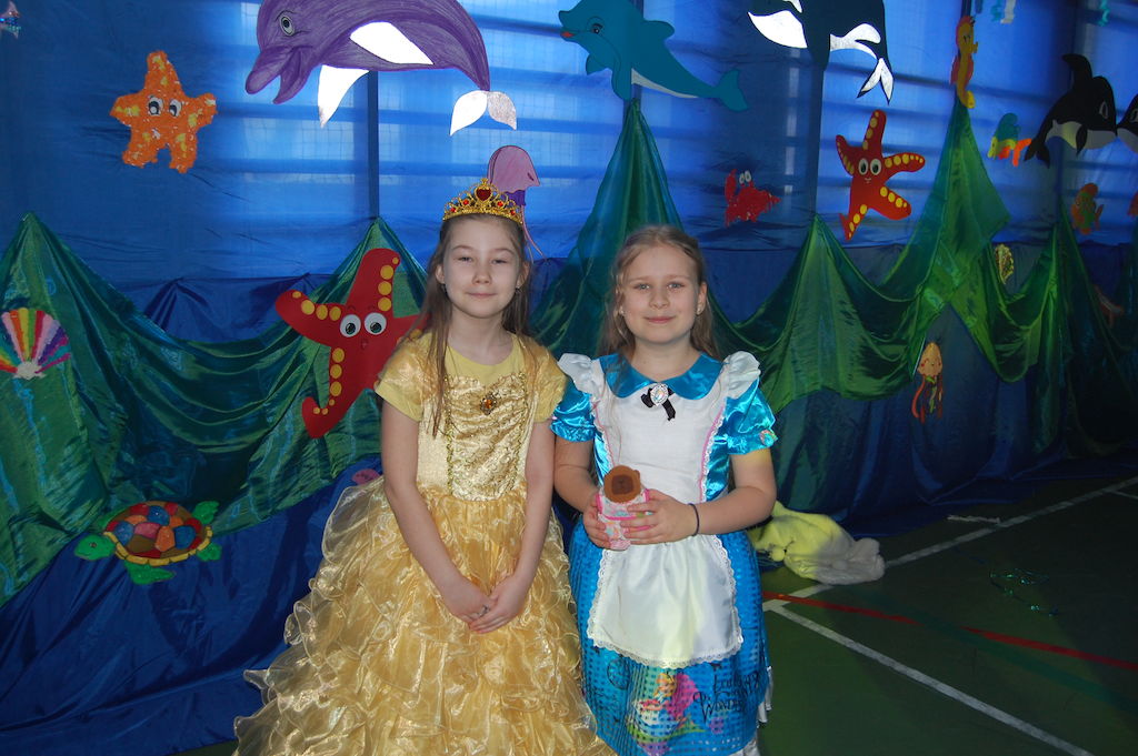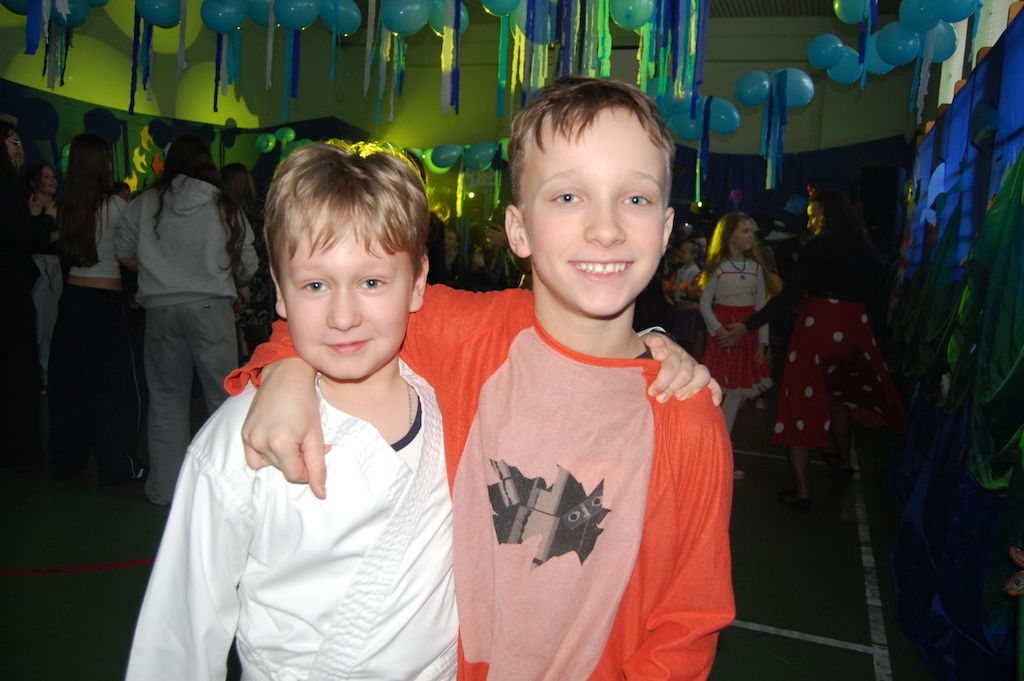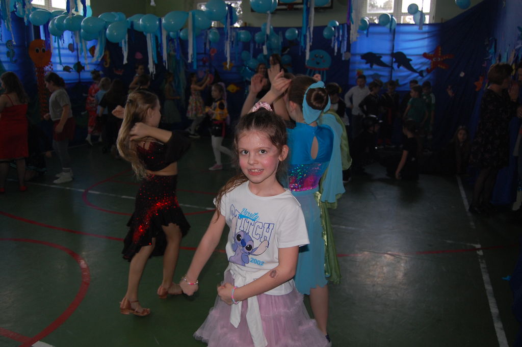 Tak właśnie było 10 lutego – mała sala sportowa, pięknie udekorowana, zupełnie zmieniła swoje oblicze i stała się prawdziwą salą balową. Przed południem bawiły się klasy 1–3, natomiast po południu parkiet należał do uczniów klas 4–6. Było to niezwykłe wydarzenie, pełne barw, pomysłowości i beztroskiej radości, które na długo pozostanie