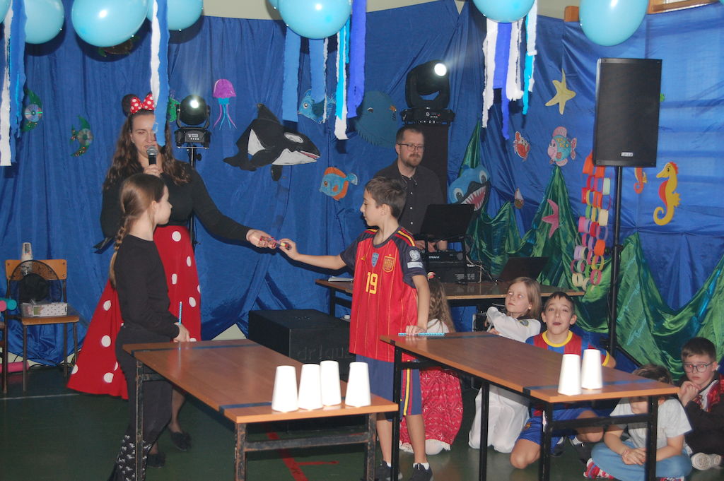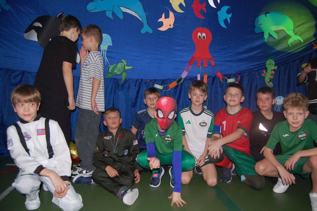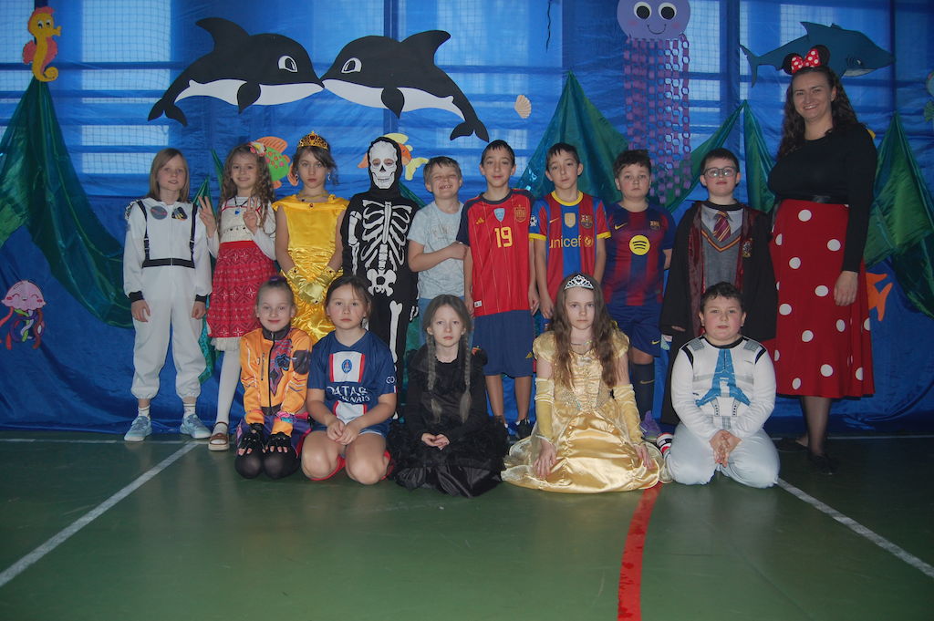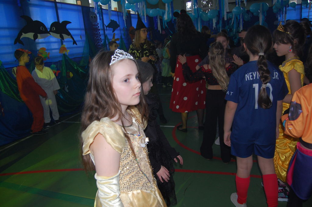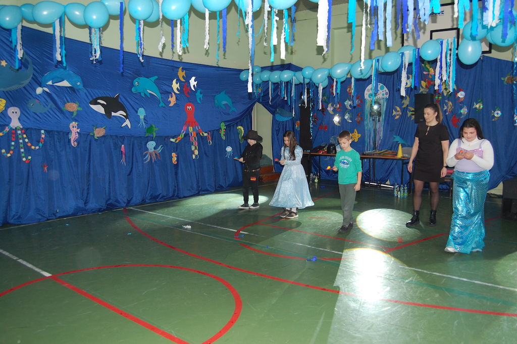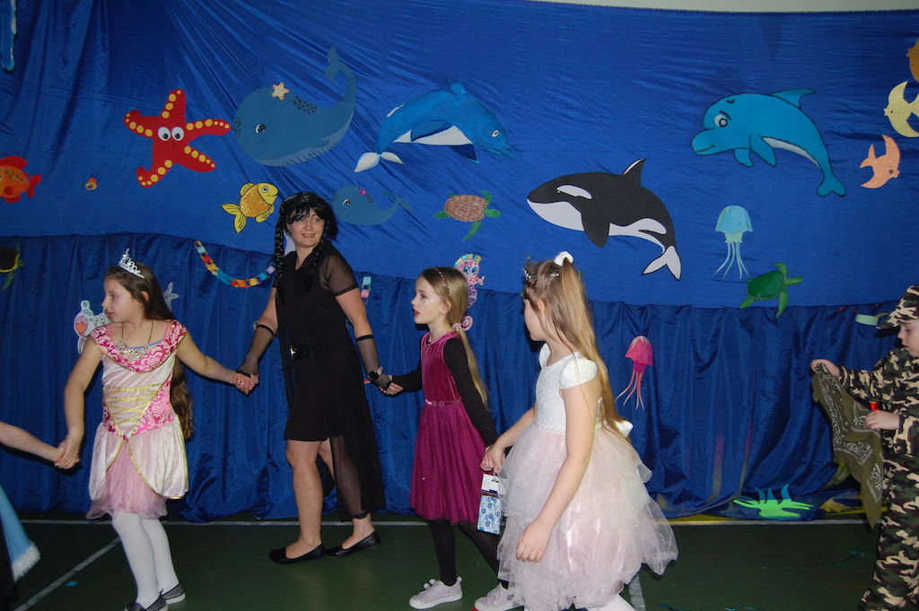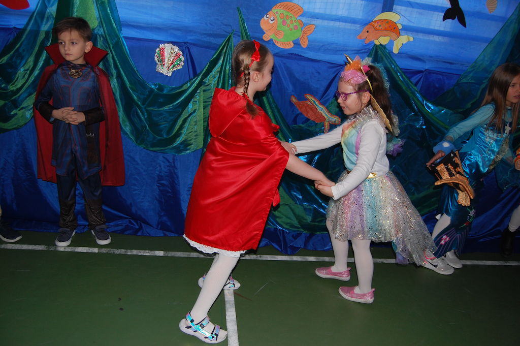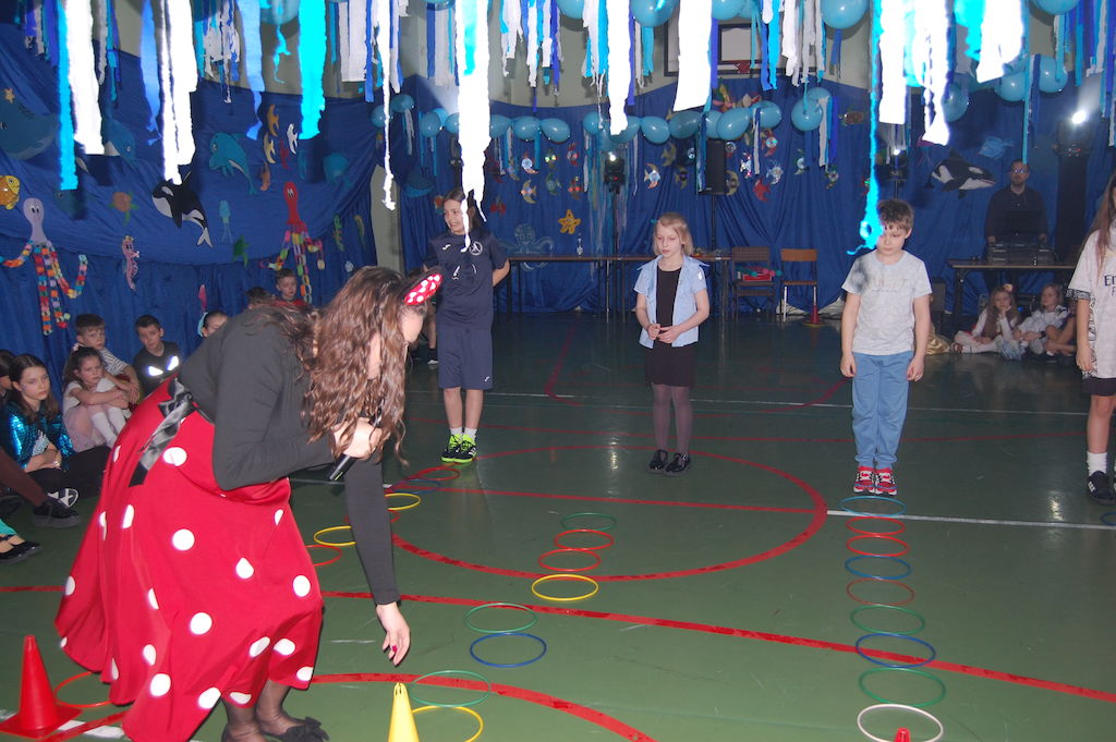 Tak właśnie było 10 lutego – mała sala sportowa, pięknie udekorowana, zupełnie zmieniła swoje oblicze i stała się prawdziwą salą balową. Przed południem bawiły się klasy 1–3, natomiast po południu parkiet należał do uczniów klas 4–6. Było to niezwykłe wydarzenie, pełne barw, pomysłowości i beztroskiej radości, które na długo pozostanie