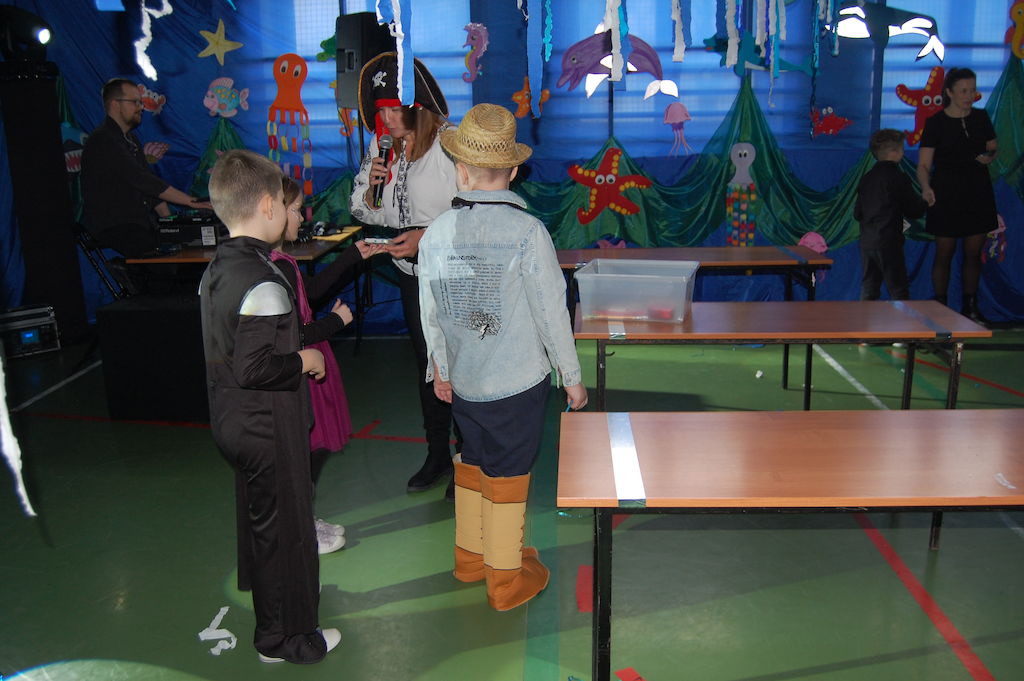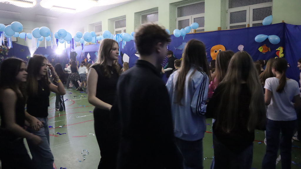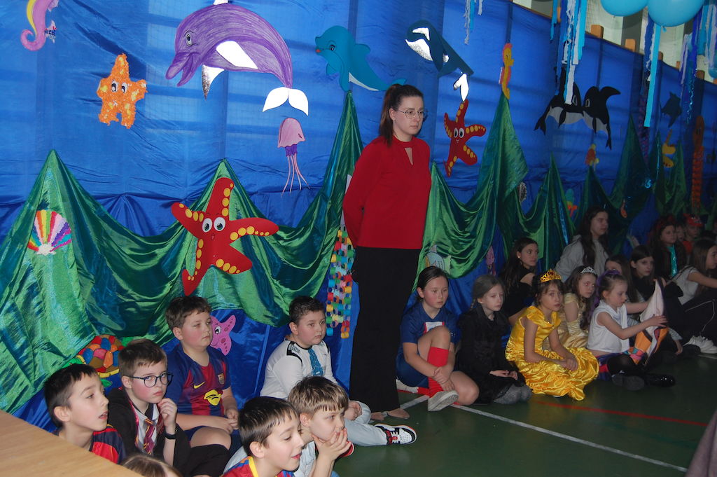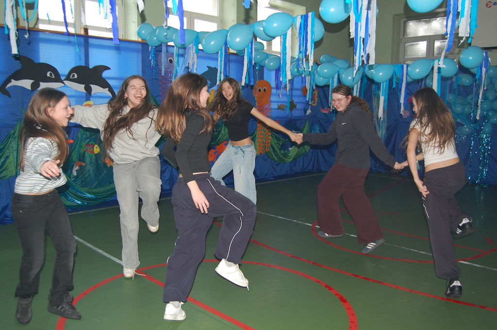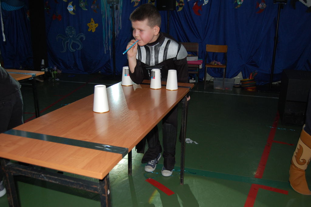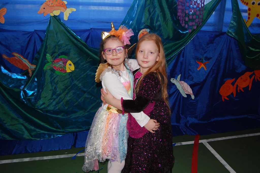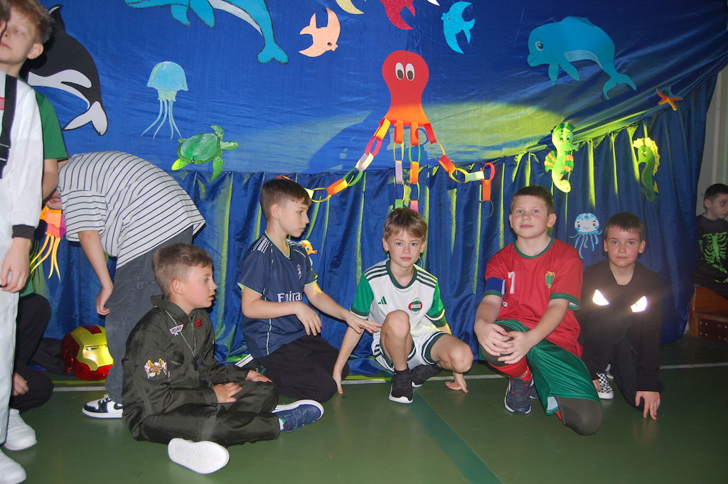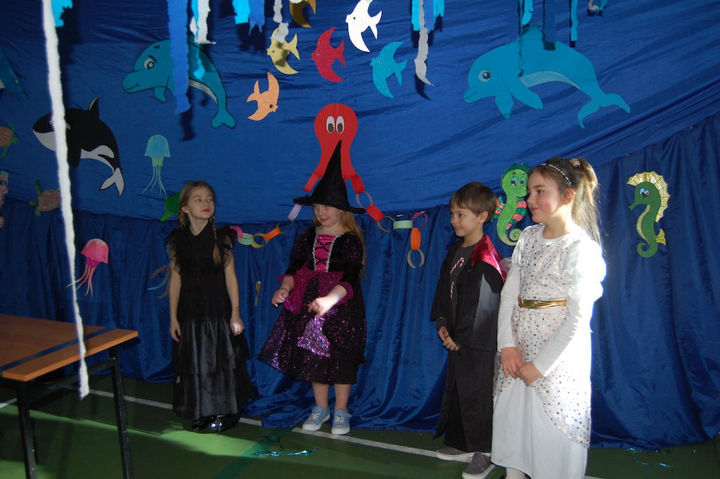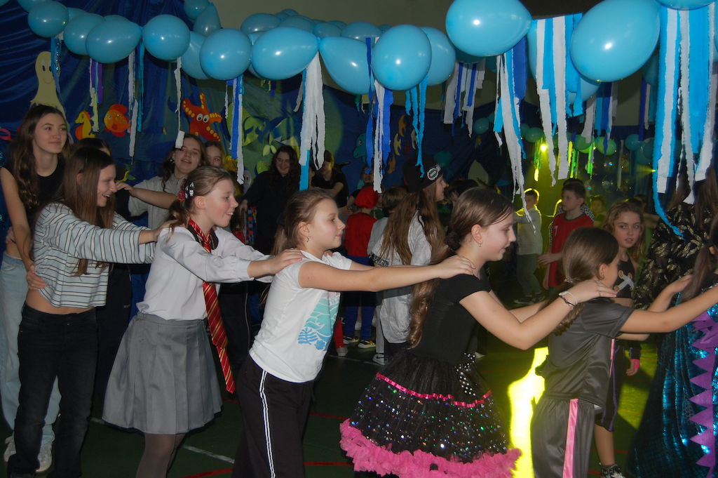 Tak właśnie było 10 lutego – mała sala sportowa, pięknie udekorowana, zupełnie zmieniła swoje oblicze i stała się prawdziwą salą balową. Przed południem bawiły się klasy 1–3, natomiast po południu parkiet należał do uczniów klas 4–6. Było to niezwykłe wydarzenie, pełne barw, pomysłowości i beztroskiej radości, które na długo pozostanie