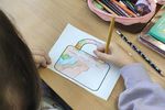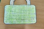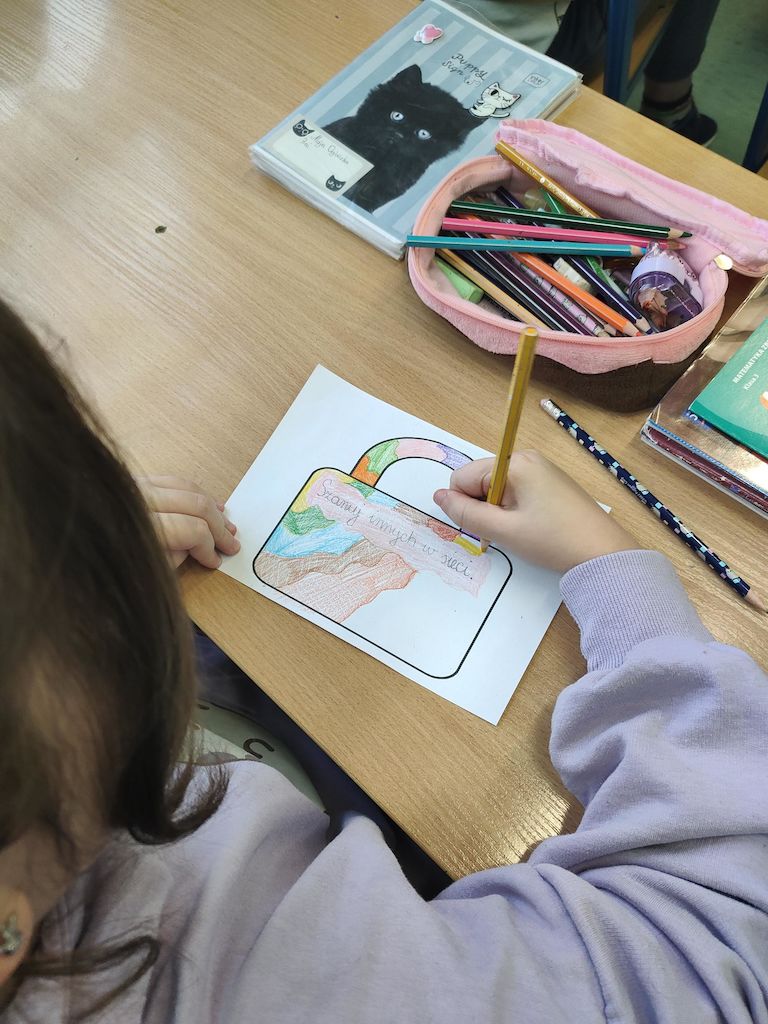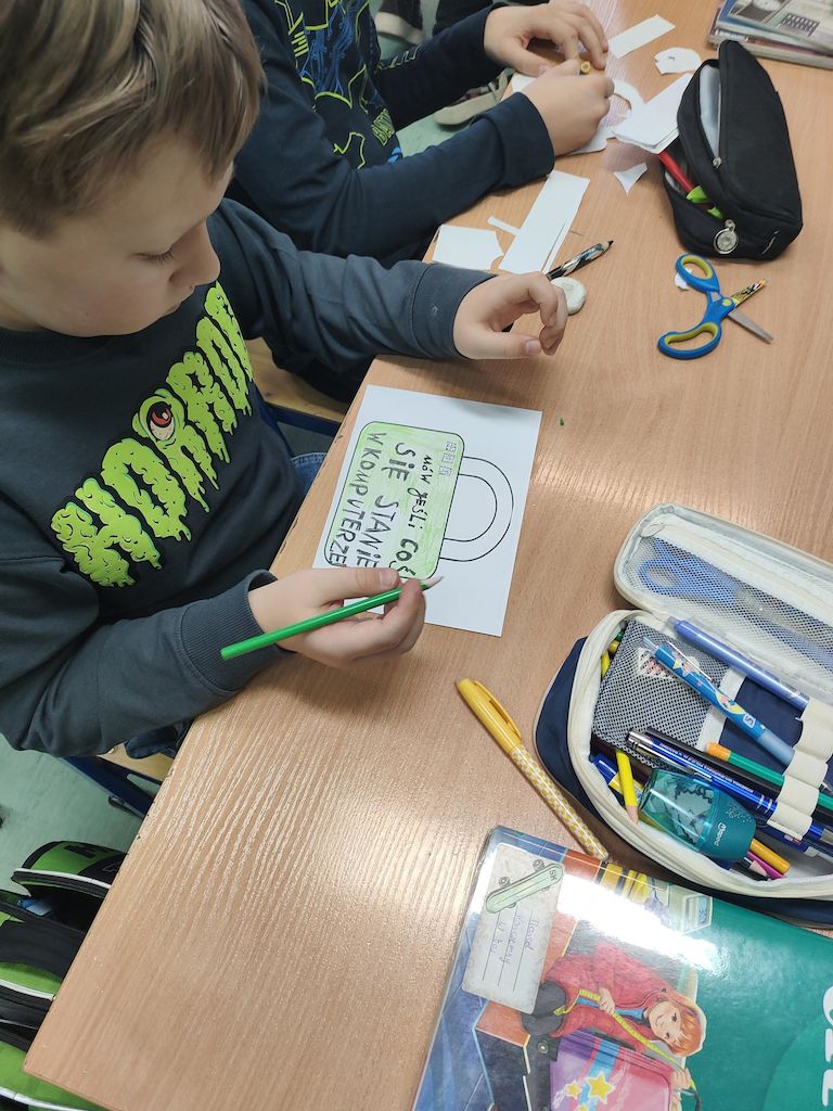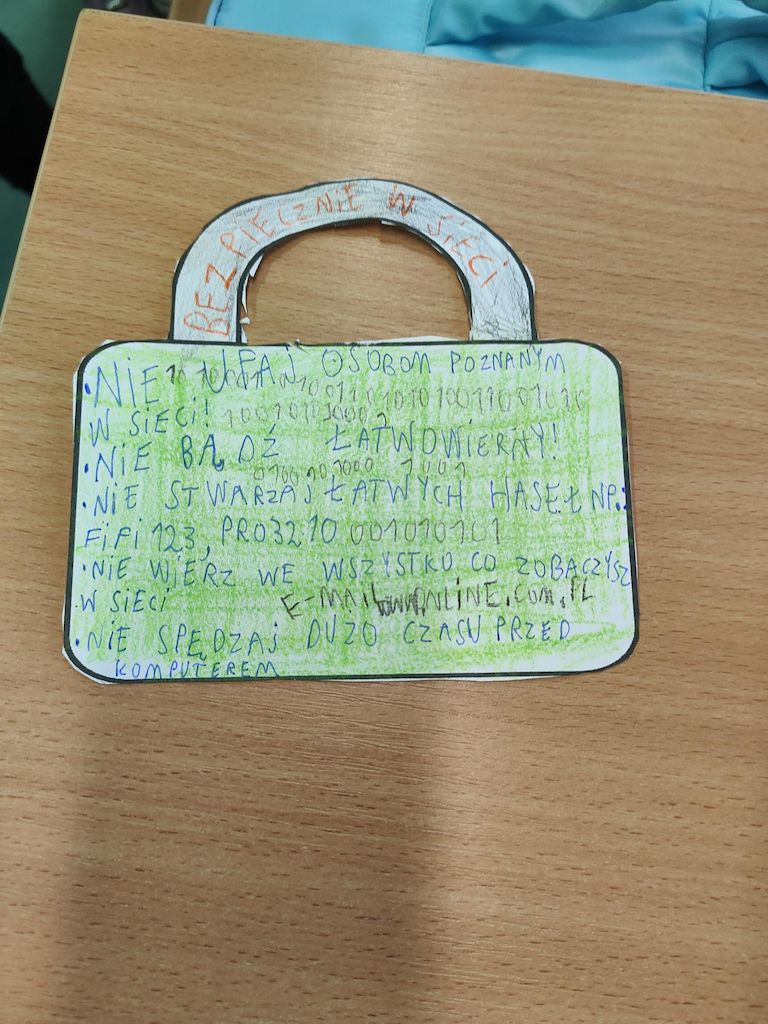 Uczniowie wykonali rysunki przedstawiające kłódki, na których umieścili hasła związane