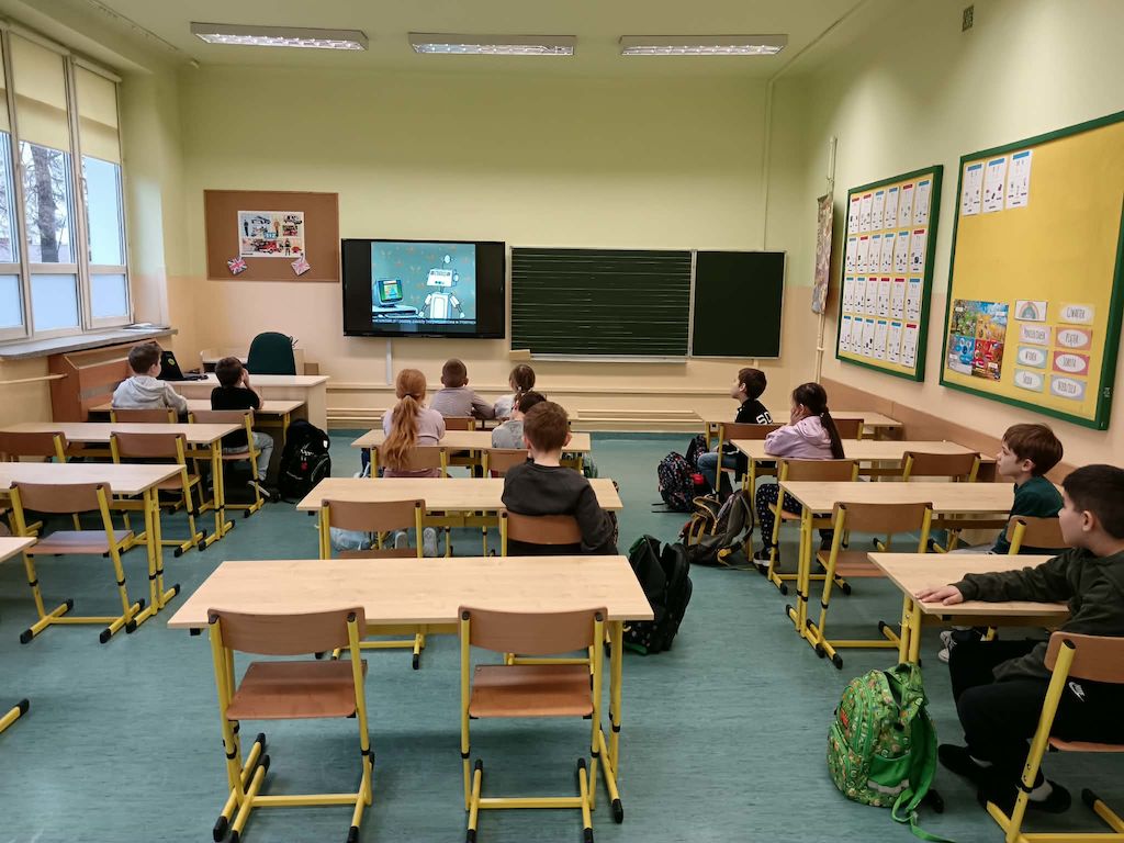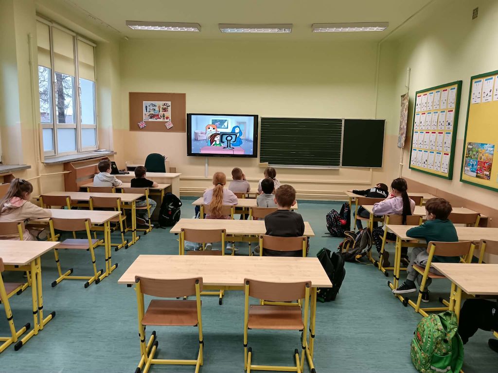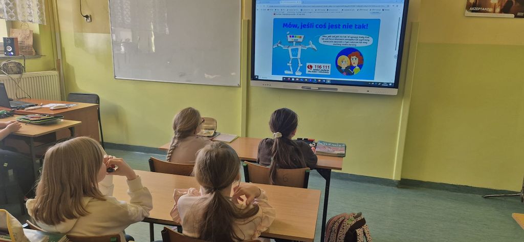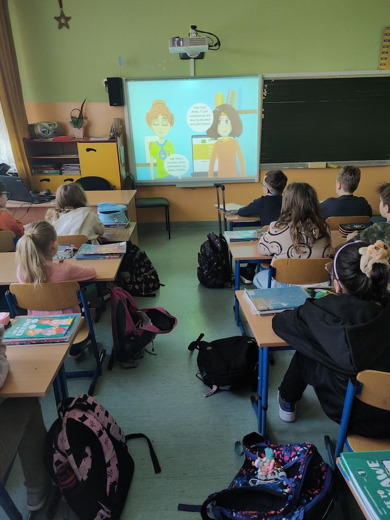 Podczas lekcji uczniowie klas 1–3 oglądali filmy edukacyjne z serwisu Sieciaki.pl, dotyczące zasad bezpiecznego korzystania z Internetu.