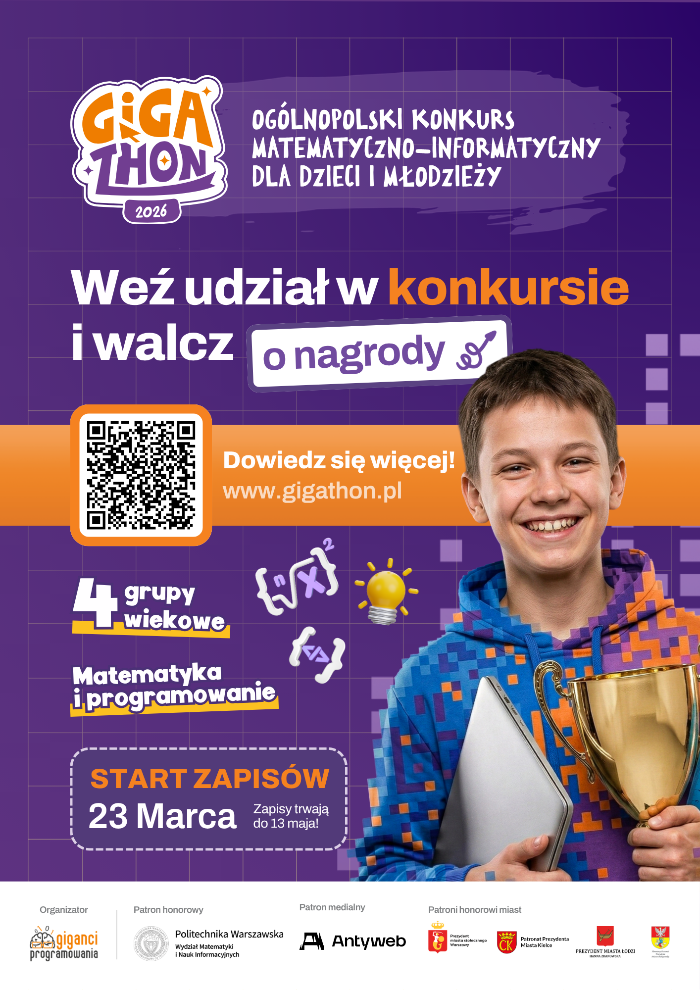 Ogólnopolski Konkurs Matematyczno-Informatyczny “Gigathon” skierowany jest do uczniów szkół podstawowych i ponadpodstawowych, a został objęty patronatem honorowym Ministra Edukacji, a także Politechniki Warszawskiej - Wydziału MiNI.