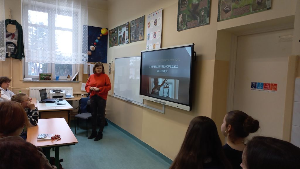 Z przepisami prawnymi dotyczącymi odpowiedzialności karnej i czynów o charakterze demoralizacji popełnianych przez osoby nieletnie zapoznała uczniów kurator zawodowa z Sądu Rejonowego w Radomiu: p. Urszula Kępczyńska - Kruk.