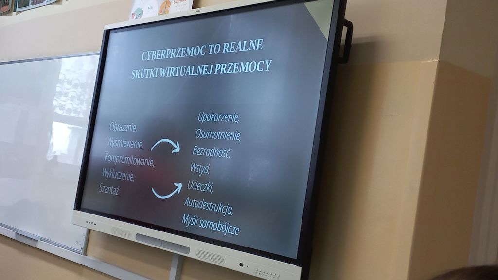 Uczniowie dowiedzieli się między innymi, czym jest demoralizacja i co ją różni od czynu karalnego. Pani kurator w bardzo przejrzysty i zrozumiały dla uczniów sposób zapoznała siódmoklasistów z prawnymi konsekwencjami stosowania cyberprzemocy, sięgania po substancje psychotropowe, papierosy i alkohol, łamaniem prawa czy niszczeniem mienia.