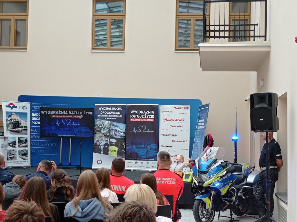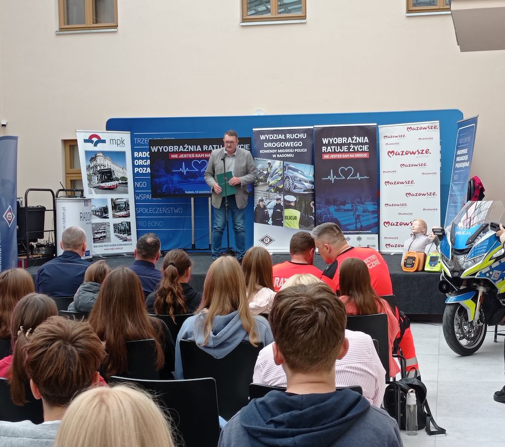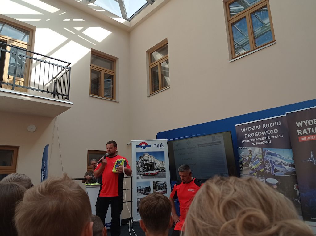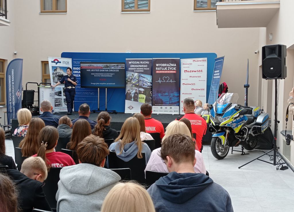 Dnia 15.09.2025 r. grupa uczniów z klas 7 uczestniczyła w kampanii profilaktycznej ”Wyobraźnia ratuje życie – nie jesteś sam na drodze” zorganizowanej przez Komendę Miejską Policji w Radomiu. Celem wydarzenia było kształtowanie odpowiednich postaw na drodze oraz uświadomienie dzieciom, młodzieży, jak ważny jest szacunek ze strony kierowców jak i pieszych. Podczas spotkania swoje prelekcje wygłosiły panie policjantki zwracając uwagę, jak należy zachować się na drogach, aby nie doszło do wypadku oraz omówiły przepisy korzystania z hulajnóg elektrycznych. Uczniowie wzięli udział w pokazie pierwszej pomocy przedmedycznej.