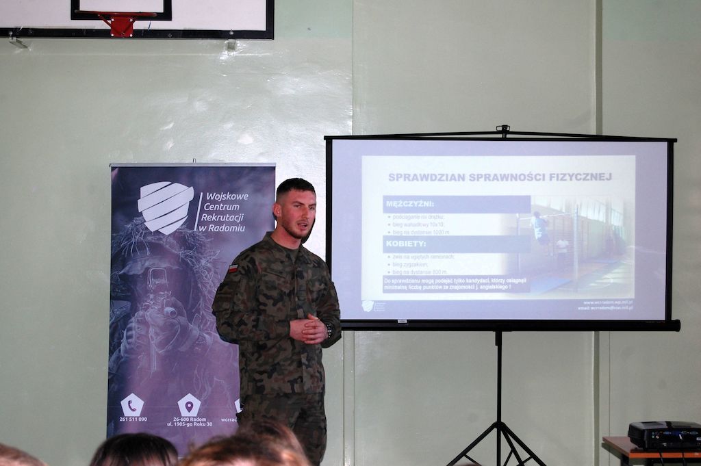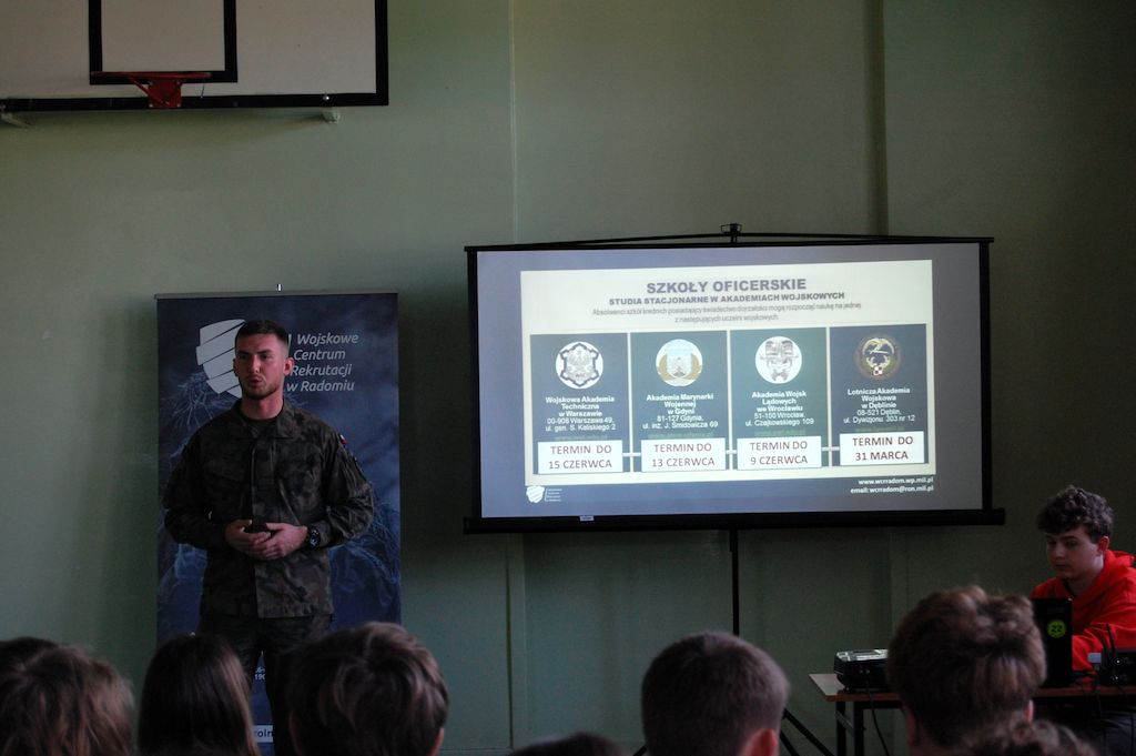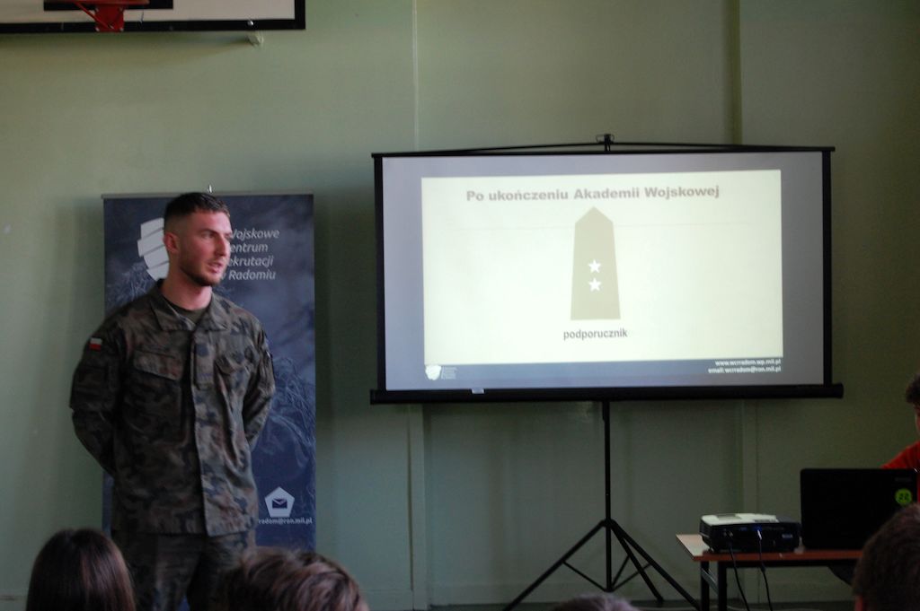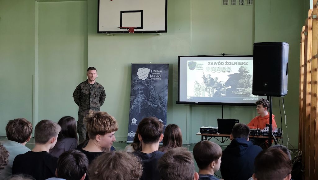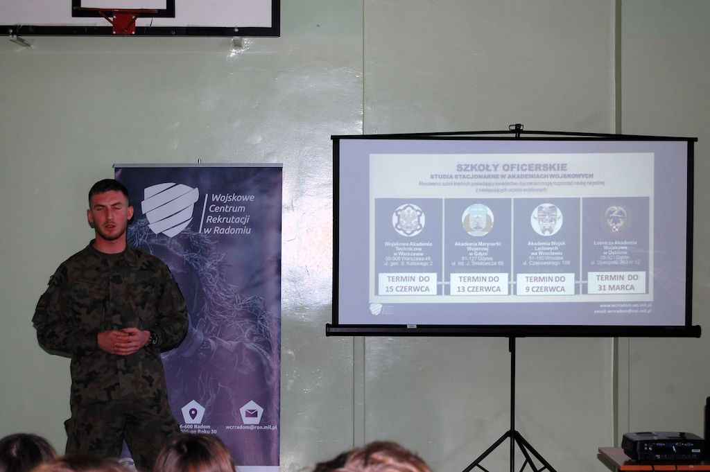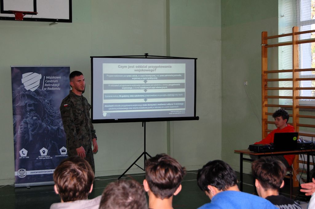 W dniu 5 listopada uczniowie klas VIII w ramach realizacji doradztwa zawodowego uczestniczyli w corocznym projekcie "Zawód żołnierz”. Spotkanie, którego gościem był szt. szer. Michał Kornecki - rekruter Wojskowego Centrum Edukacji w Radomiu odbyło się na terenie szkoły. Pan Michał zapoznał uczniów z możliwością dalszego kształcenia w Branżowych Oddziałach Wojskowych. Omówił zasady rekrutacji i organizację tych szkół. Ponadto zaznajomił uczniów z różnymi, innymi typami szkół, znajdującymi się w Radomiu i okolicach, które kształcą w zawodach związanych ze służbą w wojsku. Uczniowie dowiedzieli się także o możliwości kontynuacji nauki w Szkołach Wyższych: Wojskowej Akademii Technicznej w Warszawie, Akademii Wojsk Lądowych we Wrocławiu, Akademii Marynarki Wojennej w Gdyni oraz Lotniczej Akademii Wojskowej w Dęblinie.