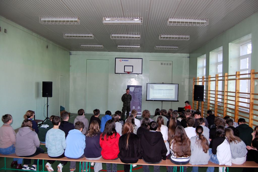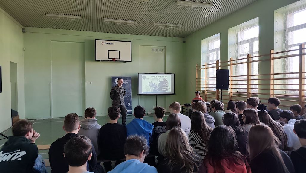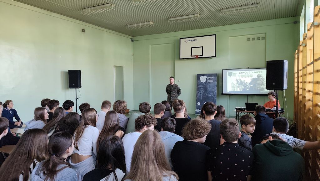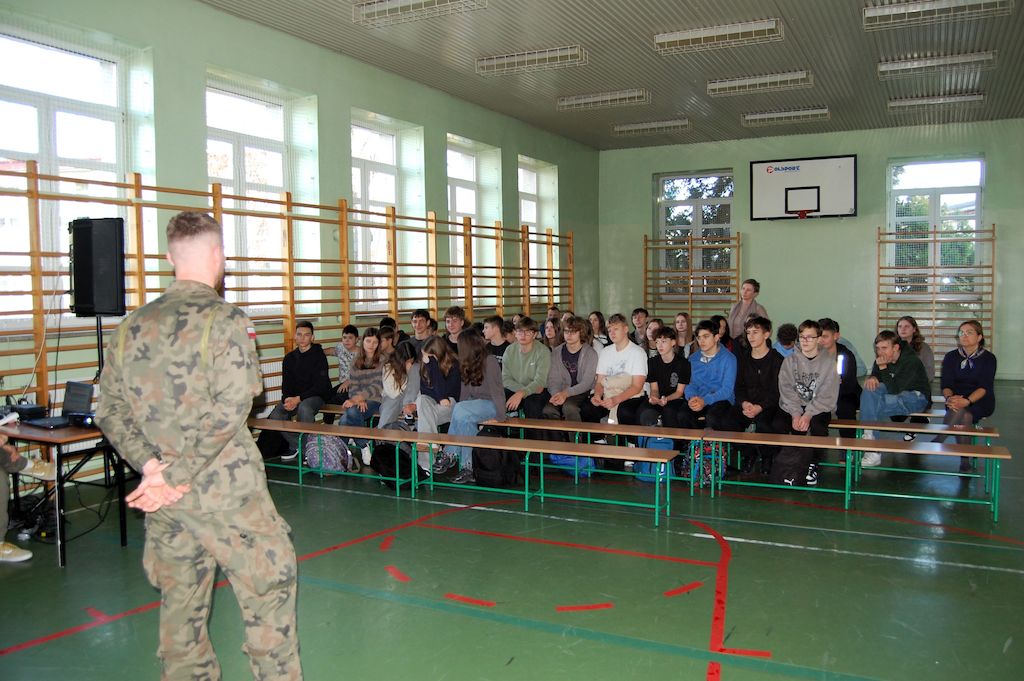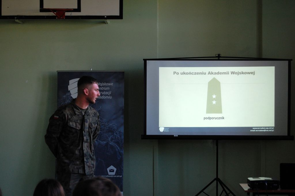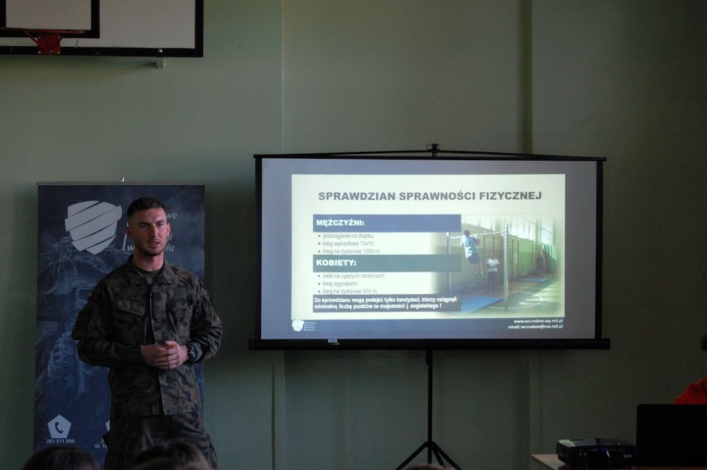 W dniu 5 listopada uczniowie klas VIII w ramach realizacji doradztwa zawodowego uczestniczyli w corocznym projekcie "Zawód żołnierz”. Spotkanie, którego gościem był szt. szer. Michał Kornecki - rekruter Wojskowego Centrum Edukacji w Radomiu odbyło się na terenie szkoły. Pan Michał zapoznał uczniów z możliwością dalszego kształcenia w Branżowych Oddziałach Wojskowych. Omówił zasady rekrutacji i organizację tych szkół. Ponadto zaznajomił uczniów z różnymi, innymi typami szkół, znajdującymi się w Radomiu i okolicach, które kształcą w zawodach związanych ze służbą w wojsku. Uczniowie dowiedzieli się także o możliwości kontynuacji nauki w Szkołach Wyższych: Wojskowej Akademii Technicznej w Warszawie, Akademii Wojsk Lądowych we Wrocławiu, Akademii Marynarki Wojennej w Gdyni oraz Lotniczej Akademii Wojskowej w Dęblinie.